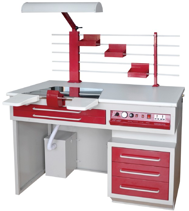The AX-JT3 Dental Workstation was developed in 2000 for the European markets. The table frame is made of steel, and the tabletop is made of high density fireproof board. It also features florescent lighting system, stainless steel plate, arm rests, retrievable air nozzle, dust extraction system, storage drawers, etc.