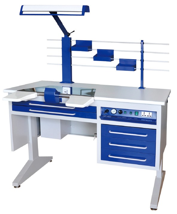 The AX-JT7 Workstation is designed by Aixin and Bowon Dental from Korea, and is developed for the East Asian markets. The table frame is made of steel, and the tabletop is made of high density fireproof board. It also features florescent lighting system, stainless steel plate, arm rests, retrievable air nozzle, dust extraction system, storage drawers, etc.
