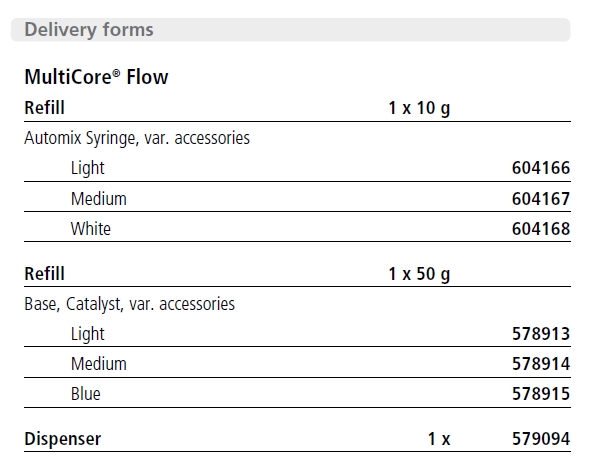 Self-curing composite core build-up material with light curing option. Two consistencies, two techniques, two curing methods and four shades provide an optimum foundation for the reconstruction of vital and non-vital teeth with part or most of the clinical crown missing.