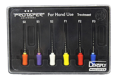 The product line: "ProTaper for Hand Use" features exactly the same instruments and clinical sequence as the rotary version. It is dedicated to all hand file users wishing to benefit from NiTi and crown-down technique. It also makes an ideal choice for the rotary file users in the treatment of difficult canal situations like, for example, apical hooks. SHAPING FILE 1 (S1) Ref: A0416-1 Lengths: 21, 25, 31 mm SHAPING FILE 2 (S2) Ref: A0416-2 Lengths: 21, 25, 31 mm FINISHING FILE 1 (F1) Ref: A0417-1 Lengths: 21, 25, 31 mm FINISHING FILE 2 (F2) Ref: A0417-2 Lengths: 21, 25, 31 mm FINISHING FILE 3 (F3) Ref: A0417-3 Lengths: 21, 25, 31 mm SHAPING FILE X SX Ref: A0416-X Lengths: 21, 25, 31 mm ASSORTMENT (SX, S1, S2, F1, F2, F3) Ref: A0418 Lengths: 21, 25, 31 mm