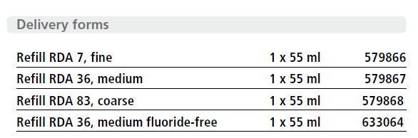 The new Proxyt prophy pastes with defined abrasive values (RDA) ensure professional, needs-oriented cleaning and polishing of teeth, restorations and implant-supported reconstructions, due to their advanced formula. The pastes contain xylitol, which inhibits the growth of the bacteria that cause caries.